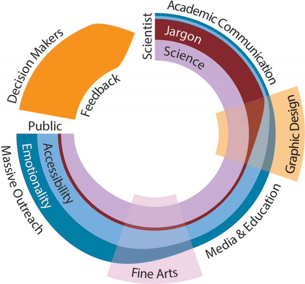 When artists are brought onto science projects, this often happens towards the end or even after the conclusion of a research project. The goal? To use art to communicate science to the general public.[1, 2] But artists have their own way of working, which is valuable beyond translating the outcomes of scientific research. As Siân Ede points out, “such work may not go much further than decoration”.[1] (Figure 1 shows an example of the role that art traditionally plays as ‘part of’ science).